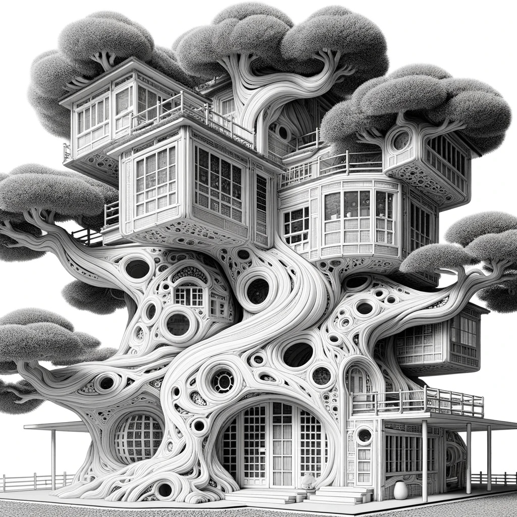 I’ve replaced straight walls with textured, gnarled partitions and creatively shaped windows that allow natural light. The upper levels are designed to mimic a tree’s canopy, with branches acting as walkways, bringing an earthly connection to everyday living.