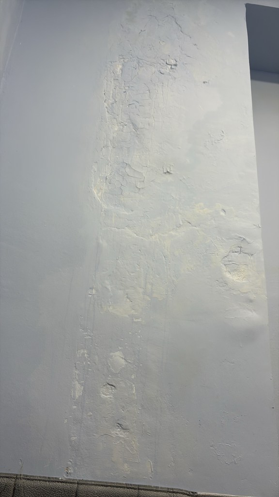 When we arrived at our recent Airbnb, the host informed us there had been a leak in the bedroom and assured us that the freshly painted wall was completely dry. All windows were wide open to air out the place. However, upon touching the wall, my finger turned white, clearly indicating wet paint and wall spungy. Over the next days, it became evident that the plaster was melting, with a persistent wet line indicating the leak remained unresolved.