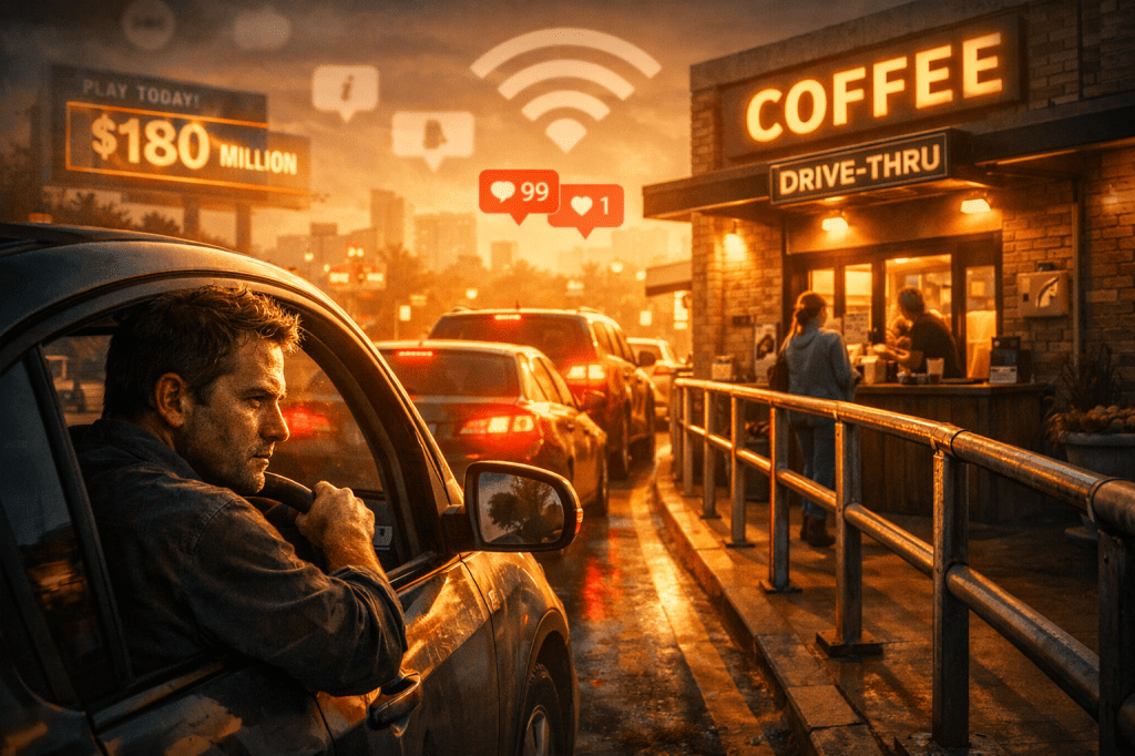 Coffee lines stretch around blocks. Cars idle. Feeds refresh endlessly. Energy drinks replace sleep. Rage replaces meaning. Commercials replace reflection.